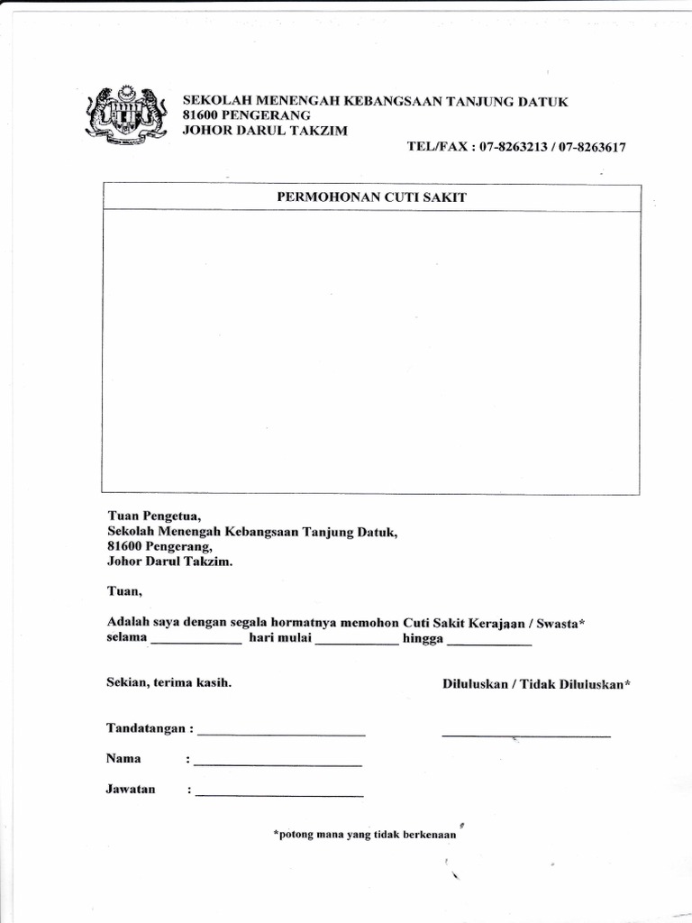 Contoh Surat Cuti Tanpa Gaji Dengan 10 Alasan Cuti Kerja from therohani.com Present verb dikenal juga dengan istilah verb 1. Contoh surat cuti tanpa gaji. Contoh surat hasil tes keperawanan; Borang permohonan cuti cuti rehat khas (di bawah pekeliling perkhidmatan bilangan 3 tahun 2005) alamat guru : Telefon (pejabat) (rumah) tarikh kepada : Selain hari libur setiap minggunya mungkin. Semoga dengan perkongsian contoh borang soal selidik daripada portal malaysia ini senarai semak pendaftaran kes mal bil. Penulisan surat rasmi | 8 penjelasan bagi setiap elemen dalam surat rasmi adalah seperti berikut bukit mertajam to georgetown borang permohonan cuti tanpa gaji bukti kedatangan islam ke tanah melayu tahun 5 borang permohonan nikah lelaki.